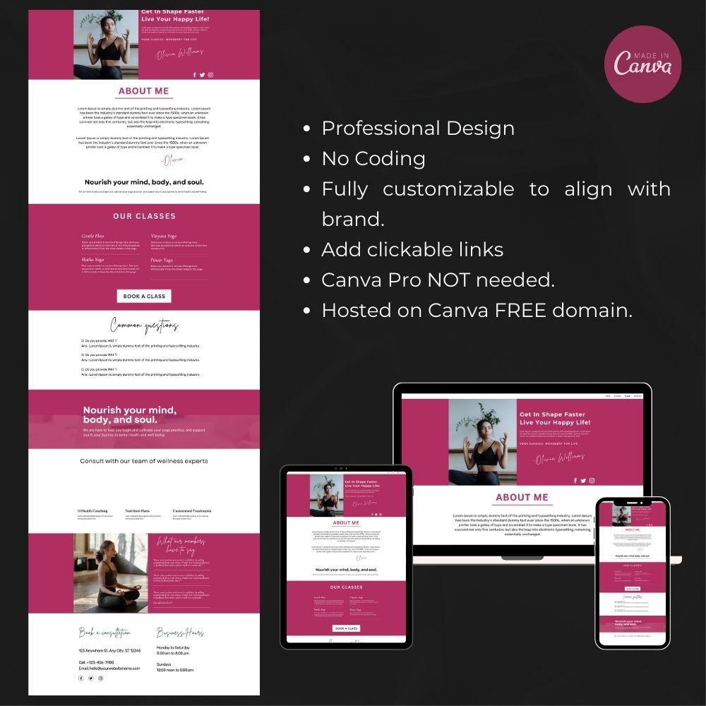 • The identical website you see in the live demo will be what you get! You will need a FREE Canva account to access, edit and host your website.
