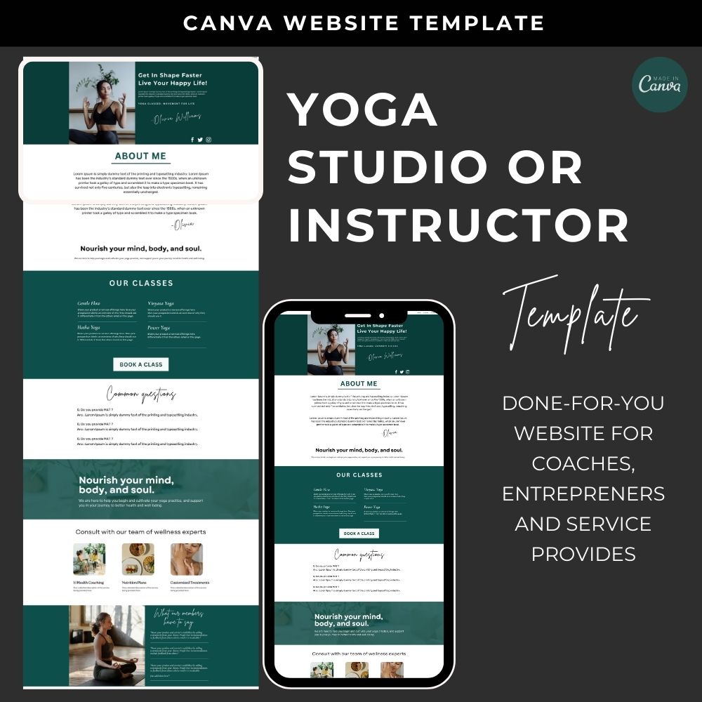 Say hello to your new and branded desktop and mobile friendly website! Having an online presence is no longer an option. Let me help you level up your yoga services business by having a piece of online yoga teacher studio website that you can send potential clients and referral partners to so you can build your brand, grow your email list, and gain more trust.With this stunning and simple-to-edit Canva website template created for yoga teacher services or literally for the ones that provide high-end services and are searching for a luxury website design, this one page website is ideal.